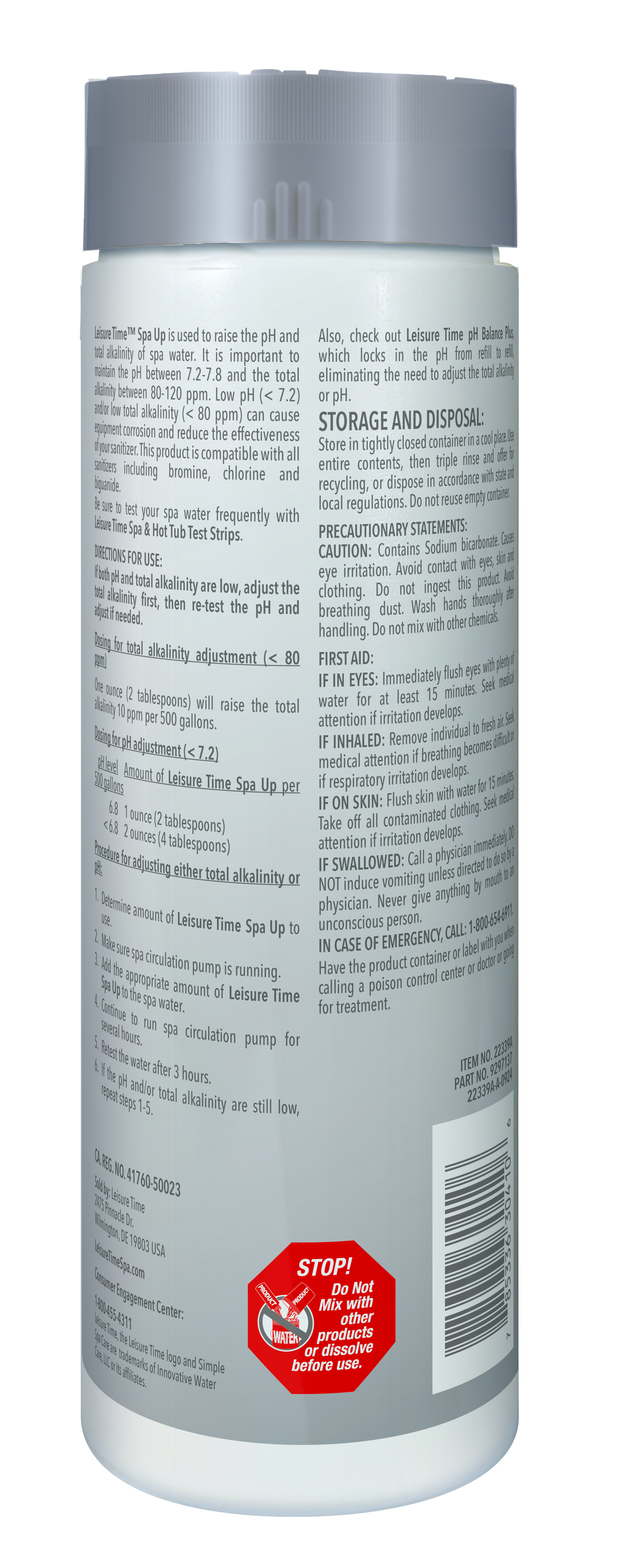 - Leisure Time® Spa Up raises pH and total alkalinity levels in your spa and hot tub water