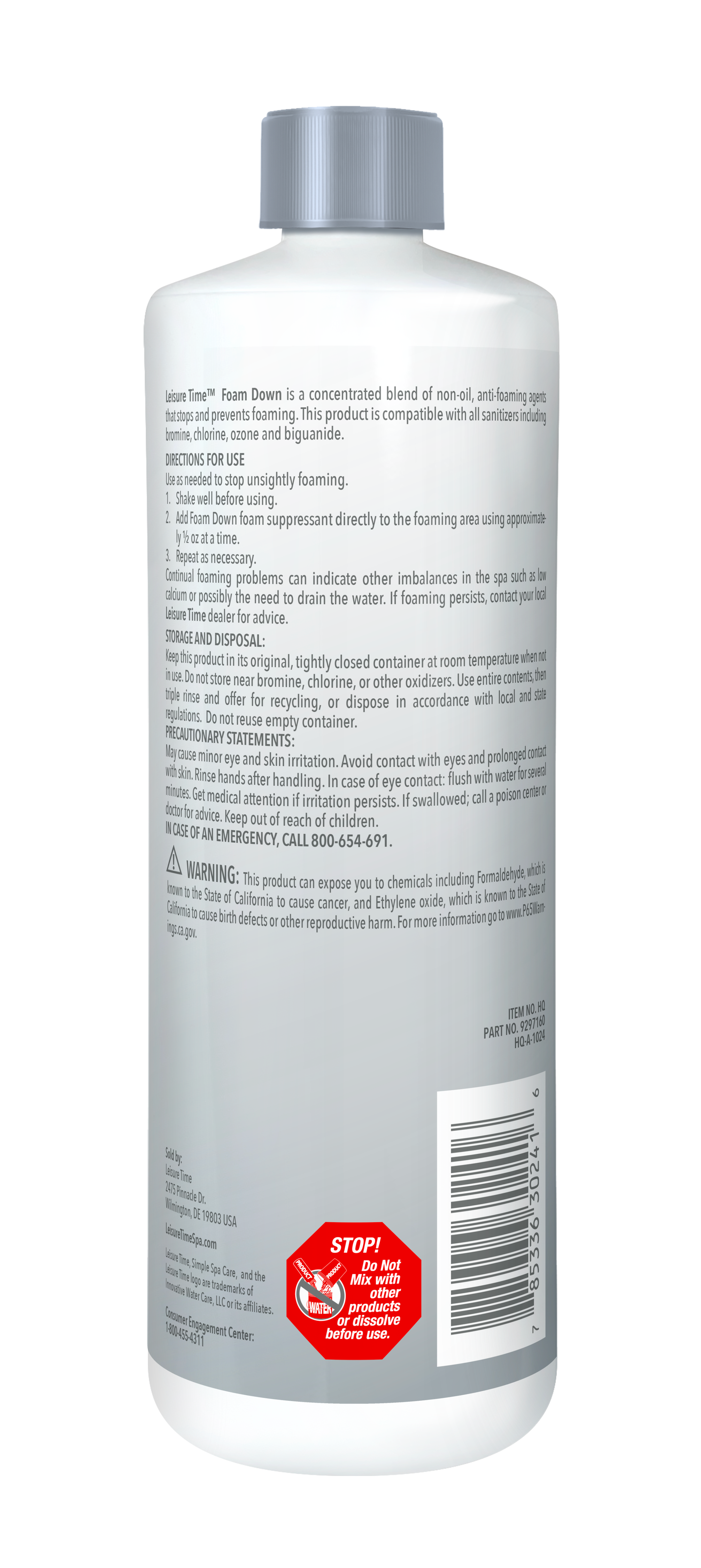 - Leisure Time® Foam Down eliminates foam on contact for a more soothing spa experience