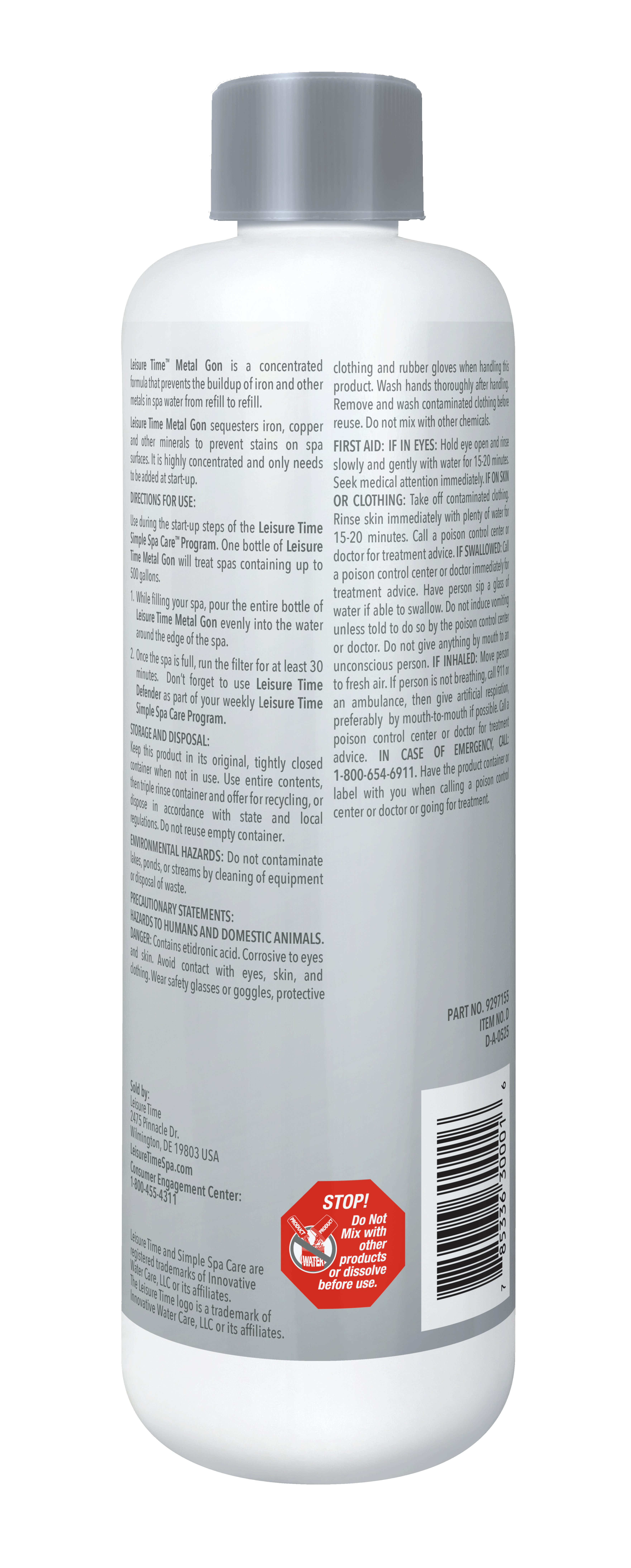 - Leisure Time® Metal Gon prevents metal and mineral stains at startup for a more relaxing spa experience