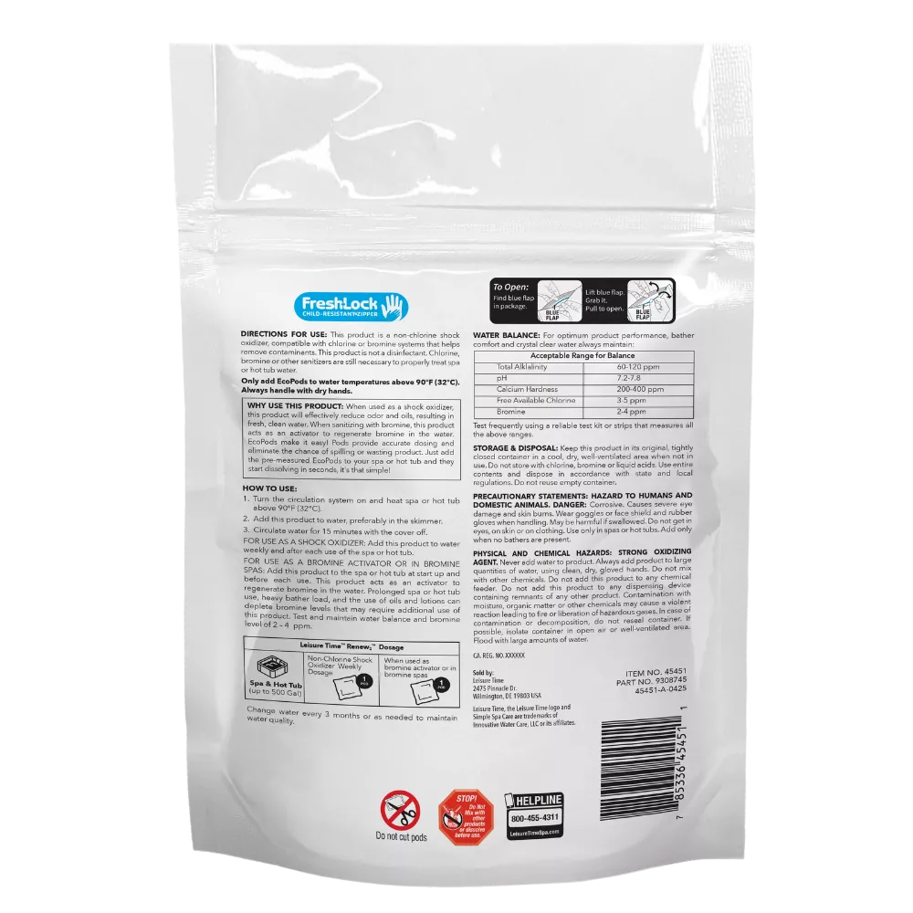 Keep your hot tub or spa clean and balanced with Renew EcoPods, a convenient, eco‑friendly oxidizing treatment from Leisure Time. Designed to deliver the same powerful results as traditional Renew shock, EcoPods offer a pre‑measured, no‑mess solution that makes routine water care quick and easy.