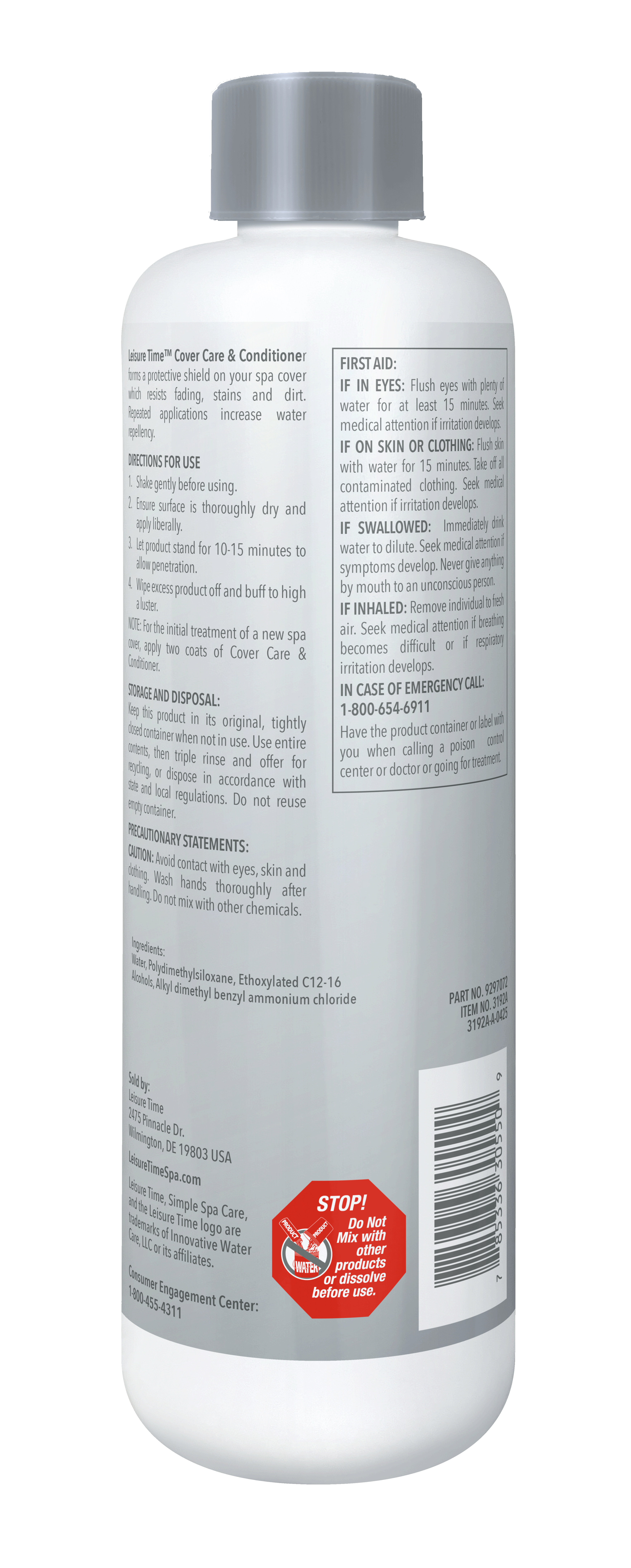 - Leisure Time® Cover Care & Conditioner restores and protects your spa cover and other vinyl surfaces