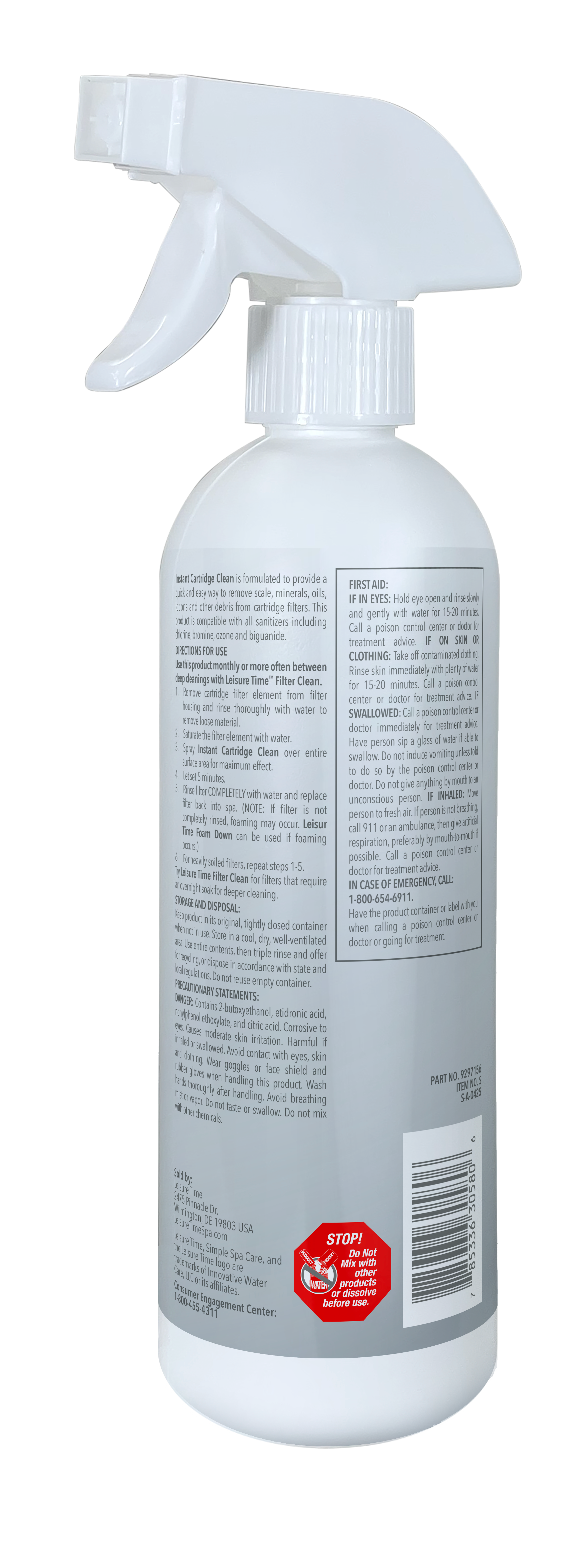 - Leisure Time® Instant Cartridge Clean is an easy-to-use cartridge filter cleaner spray that keeps spa and hot tubs beautiful and relaxing